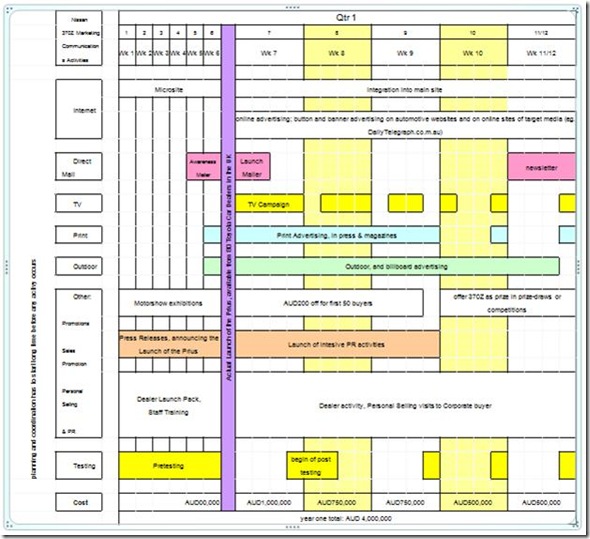 Pre-Launch: The setup of a microsite round the 370Z hybrid will happen once the 370Z hybrid has been shown on exhibitions. Direct mail will be sent before and after the launch. PR will be provided scarcely before and fully after Launch. Advertising and will set in once the product is available. TV adverts will start in a ‘wedge pattern’ (initial ‘Blitz’) (Rossiter and Danaher 1998) and flow into a ‘awareness pattern’ (Rossiter and Danaher 1998) after six months to maintain awareness for a product that has a long purchase cycle and a long decision time.
